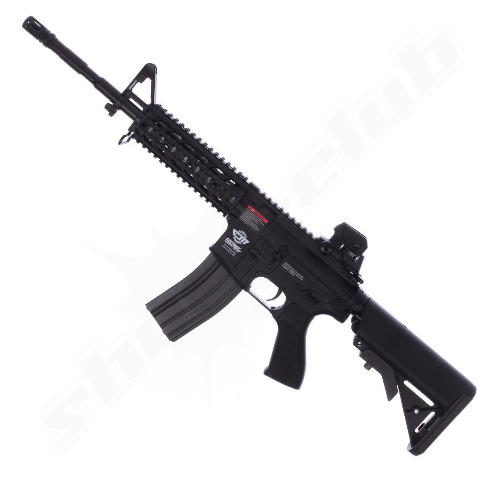 Die CM16 Serie aus dem Hause G&G ist speziell für die günstigen und sehr hochwertigen Einsteigerwaffen im AEG Bereich bekannt geworden. So verhält es sich auch bei der CM16 Raider L. Der Body der Waffe besteht zwar nicht aus Metall, aber dafür aus hochwertigem und extrem stoßfestem Kunststoff, der Metallbodies in nichts nachsteht. Außerdem verfügt die Waffe über ein RIS - System an dem Zubehör wie Griffe und Optiken befestigt werden können.