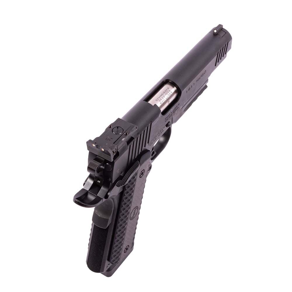 Die Schmeisser Hugo 1911 Pistole im Kaliber 9mm Luger ist ab Werk mit allen klassischen Ausstattungsmerkmalen einer 1911 versehen. Gecheckerte Griffschalen sorgen für einen guten Griff und sicheren Halt in stressigen Situationen. Die Schmeisser 1911 besitzt eine starre Novak-Visierung. Vorne am Schlitten befinden sich Durchladerillen, die den Schlitten griffiger machen und das Zurückziehen erleichtern. Mittels Picatinny-Schiene am Griffstück kann weiteres Zubehör angebracht werden. Im Lieferumfang sind insgesamt 2 Magazine enthalten.